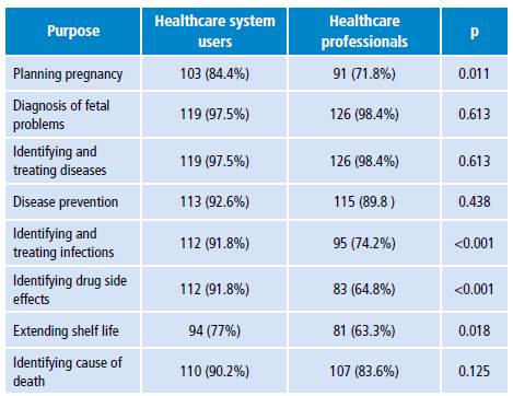 With respect to the differences found, in the study by Boeldt et al.14, technology based inquiries were predominant in HSU, that is, they support diagnoses made by technologies more than those made by a health professional. These authors also reported that, unlike the findings of this study, most of the HSU did not support technologies use by PS in different medical situations.