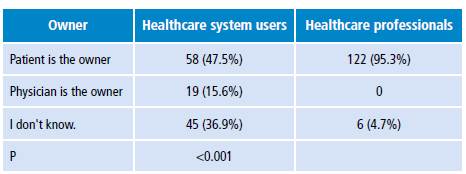 There are no marked differences between the two groups regarding data privacy concerns. However, there are significant differences with respect to the opinion of the HSU, since 50% consider that they should be the owners of their own medical records and more than 30% do not know to whom it belongs. Moreover, 5% of the HP do not know who owns the medical record either.