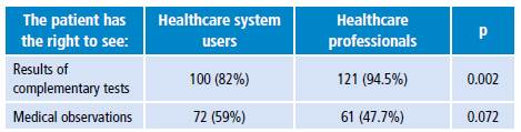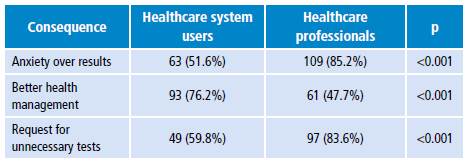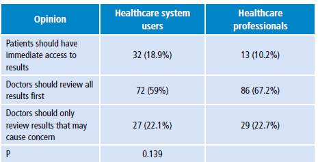 Regarding access to medical records and the privacy of information, both HP and HSU have the same concern over the privacy of medical data; this was evident in this research and in the study of Boeldt et al.14 The HP, faced with possible patient access to medical records, believe that this would generate anxiety and lead them to request unnecessary diagnostic tests. In contrast, the HSU believe this would contribute to better management of their health.
