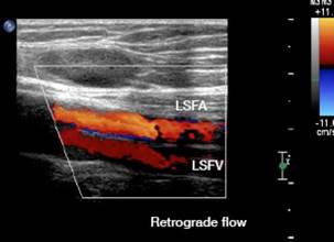 Figure 2: Doppler ultrasound of the left lower limb: superficial femoral vein thrombosis with retrograde flow.
