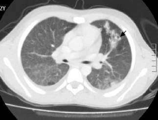 Figure 5: CT scan with cavitating lung nodules (black arrow).