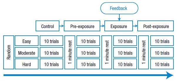 Cross-sectional study with time series evaluations including four measurement stages in the same group: control, pre-exposure, exposure (with auditory feedback) and post-exposure. Figure 1 presents the four stages of the research, which consisted of the tasks that were executed, classified according to the difficulty level. The third stage (exposure) corresponds to that implemented with the auditory feedback system.