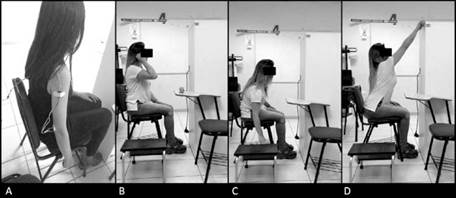 Figure 2: Execution of the tasks with different difficulty levels. A) initial position of the participants and positioning of the inertial sensor; B) easy task; C) moderate task; D) hard task.