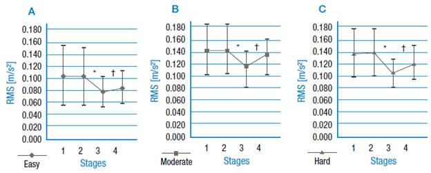 Table 1: Differences (mean) of the root mean square and the speed of execution of the task between the stages of the study and difficulty level of the task.