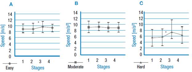Figure 4: Average execution speed of the participants (n=45) depending on the stage and difficulty of the task. A) trials associated with an easy task; B) trials associated with a task of moderate difficulty; C) trials associated with a difficult task. 1: control stage; 2: pre-exposure stage; 3: exposure stage; 4: post-exposure stage. * represents statistically significant differences (p<0.01) between the pre-exposure and exposure stages.