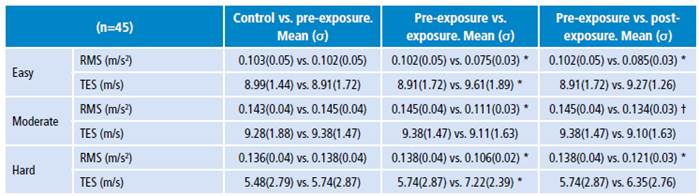 σ: standard deviation; RMS: raíz root mean square; TES: task execution speed. * p<0.001 † p<0.01 Source: Own elaboration.