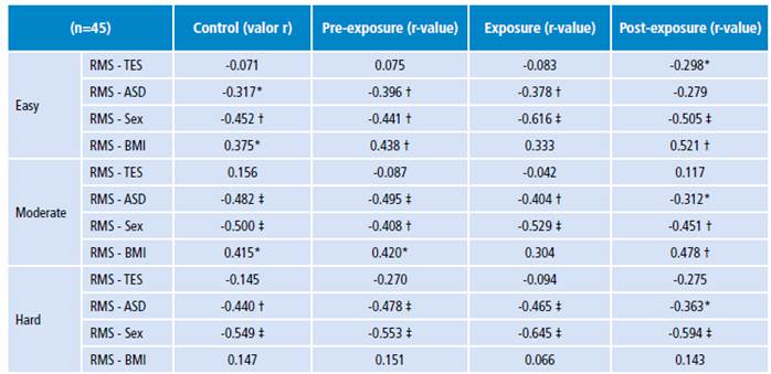 RMS: root mean square; TES: task execution speed; ASD: acromion-sensor distance; BMI: body mass index; r-value: correlation coefficient through Spearman rank correlation. * p<0.05 † p<0.01 ‡ p<0.001 Source: Own elaboration.