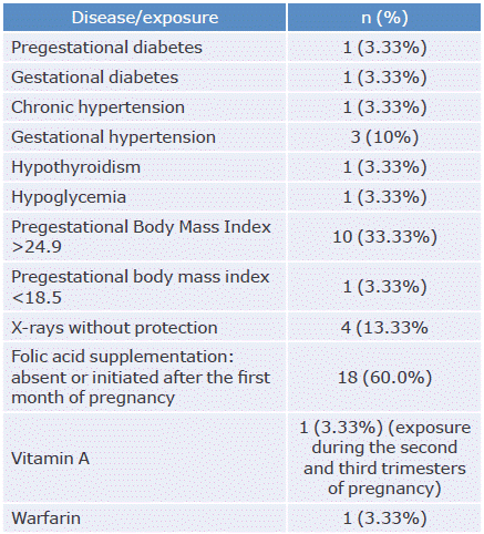 A survey was administered to the mothers of 30 children aged 0 to 5 years with CDH treated in 2 health institutions of Cali, Colombia. The instrument was oriented to collect data on multiple prenatal exposure variables, and data collected were entered into an Excel database in order to analyze them using descriptive statistics.