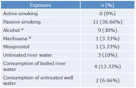 Se evidenciaron varias exposiciones potencialmente asociadas a CC, tales como índice de masa corporal alterado, administración inadecuada de suplementos de ácido fólico y exposición a vitamina A, rayos X, alcohol y cigarrillo.
