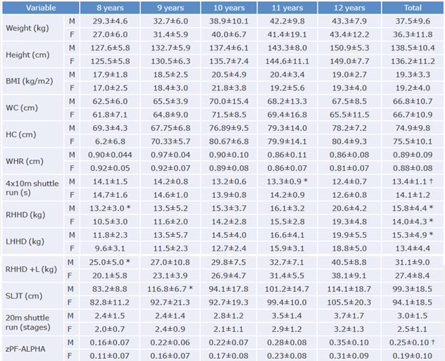 M: male; F: female; BMI: body mass index; WC: waist circumference; HC: hip circumference; WHR: waist-to-hip ratio; RHHD: right hand-held dynamometry; LHHD: left hand-held dynamometry; RHHD +L: right hand-held dynamometry + left; SLJT: standing long jump test; zPF-ALPHA: physical fitness-ALPHA. * p< 0.05. † p< 0.01. Source: Own elaboration.
