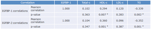 IGFBP-1: insulin-like growth factor-binding protein 1; IGFBP-2: insulin-like growth factor-binding protein 2; Total-c: total cholesterol; HDL-c: HDL cholesterol; LDL-c: LDL cholesterol; TG: triglycerides. * Significant correlation (p<0.05). Source: Own elaboration.