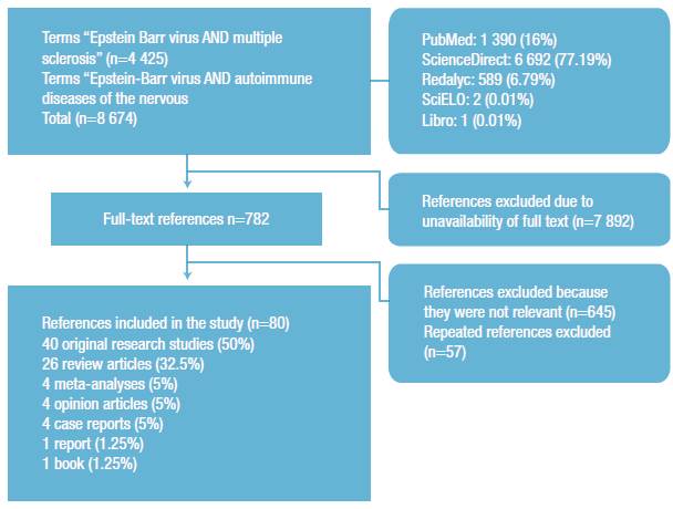 A structured bibliographic search was performed with a range of 59 years (1960-2019) in order to collect historical and updated information on the EBV-MS association. The search was made in English and Spanish in the following databases: PubMed, ScienceDirect, Redalyc and SciELO. The following MeSH terms were used: "Epstein-Barr virus, multiple sclerosis, autoimmune diseases of the nervous system", and the equivalent DeCS terms in Spanish: "Virus de Epstein-Barr, esclerosis múltiple, enfermedades autoinmunes del sistema nervioso". The combination of operators used in English was "Epstein-Barr virus AND multiple sclerosis" and "Epstein-Barr virus AND autoimmune diseases of the nervous system", and in Spanish "Virus de Epstein-Barr Y enfermedades autoinmunes del sistema nervioso" and "Virus de Epstein-Barr Y enfermedades autoinmunes del sistema nervioso".