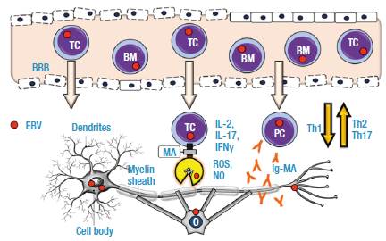 EBV is an immortalizing agent and polyclonal activator of B cells 3 that induces modifications in plasma membranes and leads to immunomodulation imbalance between regulatory T cells (Tregs), Th1/Th2/Th3/Th17 responses, cytotoxic T cells (CD8+), NK cells and the signaling pathways that control cell viability and survival. All these changes favor the development of autoimmune diseases, such as multiple sclerosis (MS), in genetically predisposed individuals. 4-6