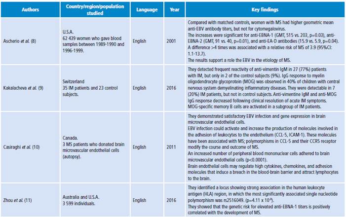 The following types of study were included: original research, review articles, opinion articles, case reports, reports, and books focusing on historical, biological, immunological, epidemiological and experimental aspects of the findings of the EBV-MS association. Books with relevant information about the association were also reviewed.