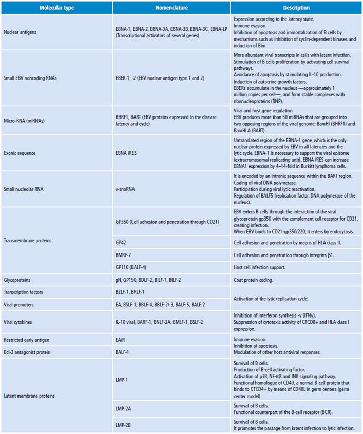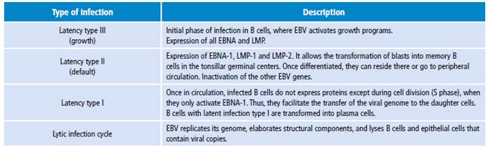 EBV also encodes EBNA (nuclear antigens) and LMP (latent membrane proteins), among other transcripts, that make way for it in the host. 16-18 The expression of different viral genes may vary according to the evolution of the early, latent (chronic) and transformation (neoplasm) infection (Table 2).