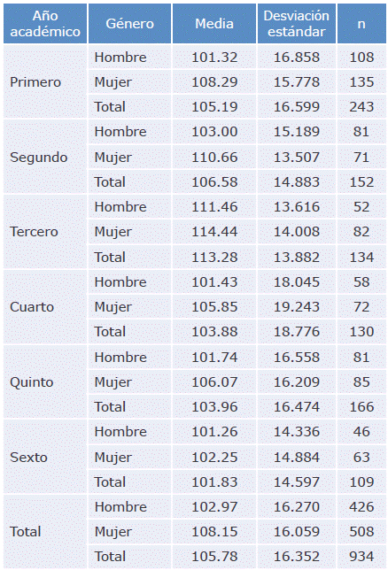 La prueba T2 de Hotelling (F=142.6) y la de no aditividad de Tukey (F=174.8) fueron significativas (p<0.005). En el primer caso, a partir de estos resultados se infiere que las medias de las preguntas son diferentes entre sí, lo cual demuestra que no todas las preguntas hacen el mismo aporte a la media global del instrumento (media=5.29); por otra parte, en el segundo caso, el valor F obtenido permite concluir que es necesario elevar la potencia de esta prueba (prueba de no aditividad de Tukey) para conseguir el carácter aditivo de los datos. Los resultados de la estimación de las medias, la desviación estándar y el tamaño de la muestra para cada nivel de los dos factores estudiados (año académico y género) y de la combinación de los niveles de ambos factores se muestran en la Tabla 1.