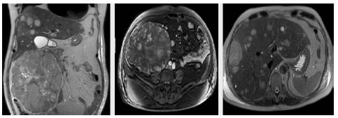 A magnetic resonance (MRI) of the abdomen showed a large retroperitoneal mass of 19x18x13cm, which displaced the ascending colon, the second duodenal portion, and the head of the pancreas. The lesion had a heterogeneous signal pattern in sequences with T1 and T2 information, predominantly hyperintense, with heterogeneous enhancement after administration of contrast medium. These findings suggested solid lesion with associated hemorrhagic residuals and multiple focal liver lesions that had a similar pattern (Figure 2).