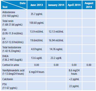 The laboratory tests in his previous medical chart showed elevation of FSH, LH and total testosterone (Table 1). The patient did not receive adjuvant management for the adrenal carcinoma. A diagnosis of adrenal insufficiency requiring mineralocorticoid replacement was also made after the procedure.
