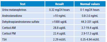 On admission, the patient presented tachycardia, blood pressure of 186/117 mmHg, body mass index of 26.7 kg/m2, cushingoid facies, central obesity, gynecomastia, ecchymosis in the arms (without skin atrophy), signs of congestion such as jugular vein distention and bilateral edema in the lower limbs. No alterations in hemogram, renal function, electrolytes or liver function were observed in the admission tests.