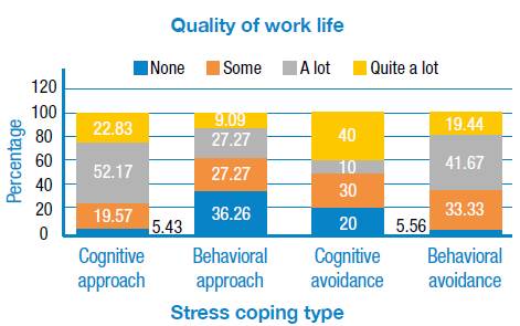 Three of the CVP35 subscales are significantly correlated to the stress coping type (CRI-Y Questionnaire): managerial support (p=0.021 ), intrinsic motivation (p=0.000) and QWL (p=0.009). Figure 3 shows the variation in the perception of the Quality of life at work subscale of the CVP35 questionnaire with the stress coping type.