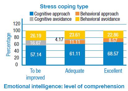 The correlation between coping type and the three subscales of the TMMS-24 questionnaire, through χ2, presents: perception level p=0.059, comprehension level p=0.027 and regulation level p=0.075. Figure 4 illustrates the correlation between coping type and level of comprehension (p=0.027). Coping through cognitive approach gradually increases from 57.14% in graduates who should improve their comprehension, to 68.57% in those who have excellent comprehension.