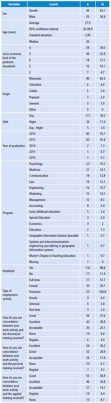 The survey was responded by 149 graduates with an average age of 28 years: 63.1% were women, 39.6% were classified in socio-economic level 4 -middle class-, 60.4% were from Manizales, 55.1% resided in this city, 79.1 % studied during the day, 5 5.7% graduated in 2013, 15.5% were graduates from the Psychology program, and 88.6% worked; of the latter, 51.7% had a full-time job. When analyzing concordance between theoretical training and some variables, it was good for 37.6% regarding their work activity, good for 36.9% regarding the applied training, and excellent for 36.2% regarding personal training (Table 1).