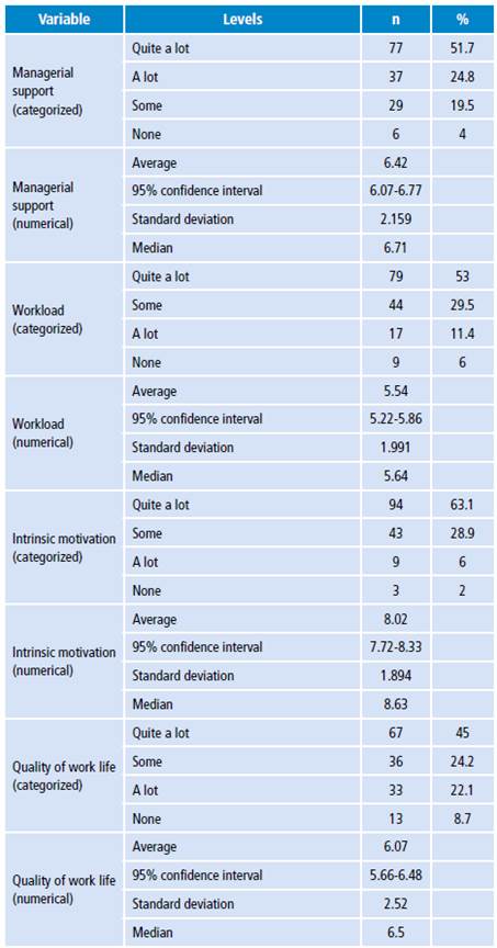 QWL was perceived as "quite a lot" or "a lot" by 67.1 %; managerial support as "quite a lot" or "a lot" by 76.5%; workload as "quite a lot" or "a lot" by 64.4%; and intrinsic motivation as "quite a lot" or "a lot" by 93%.