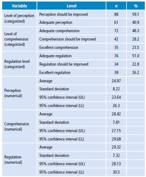Salvador-Ferrer 43 was the only study found that estimated a for the TMMS-24 questionnaire; its results were: perception 0.872, comprehension 0.779, and regulation 0.846, values that in the present study were 0.944, 0.946 and 0.916, respectively. In said study, the value obtained for the subscales of the TMMS-24 were, in the same order, 26.9, 25.43 and 27.08, which in the present work were 24.97, 28.42 and 29.32, respectively.