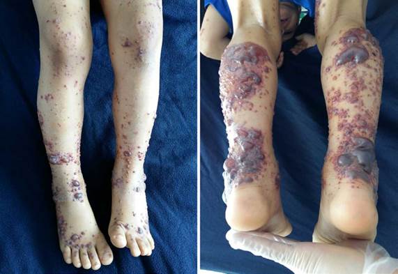 Two days after discharge, the parents took the child once again to the medical center due to a complication of his symptoms, so he was referred to a tertiary care center. The skin lesions turned into multiple phlyctenae containing translucent blood-like fluid, with variable sizes and located exclusively in the lower limbs. The physical examination revealed stable vital signs and grade 2 edema in the lower limbs accompanied by multiple palpable purpuric lesions extending to the buttocks; in addition, some of these lesions appeared in isolation in the upper limbs. Many of the skin lesions joined together and formed phlyctenae with serohematic fluid (Figure 1), mainly in the feet and legs, which generated pain on palpation and as a result of mobilization of the lower limb joints.