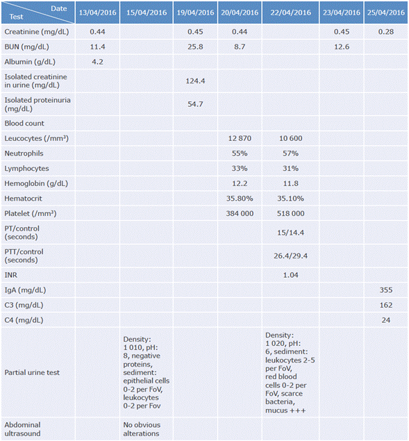 BUN: blood urea nitrogen; PT: prothrombin time; PTT: thromboplastin time; INR: international normalized ratio; IgA: immunoglobulin A; C3: complement component 3; C4: complement component 4; FoV: field of view of microscope. Source: Own elaboration.