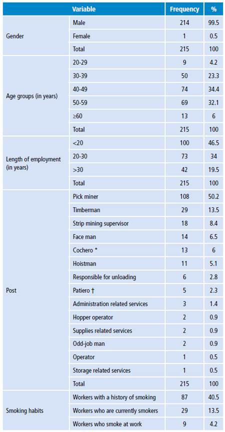The study population consisted of 215 workers, of which only 1 was a woman. The average age was 45.5 ± 9.4 years, with minimum and maximum ages of 24 and 76 years, respectively. The average length of service was 21.7 ± 10.0 years, with minimum and maximum lengths of employment of 10 and 57 years, respectively. Pick miner was the most frequent post, followed by timberman; less than 10% of the sample held other posts. In relation to smoking, 4 out of 10 workers reported a history of smoking (Table 1).