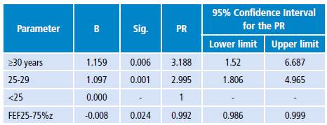 B: vector that holds estimated regression coefficients; Sig.: Significance level; PR: Prevalence ratio; FEF25-75%z: z-score of forced expiratory flow at 25-75%. Source: Own elaboration.