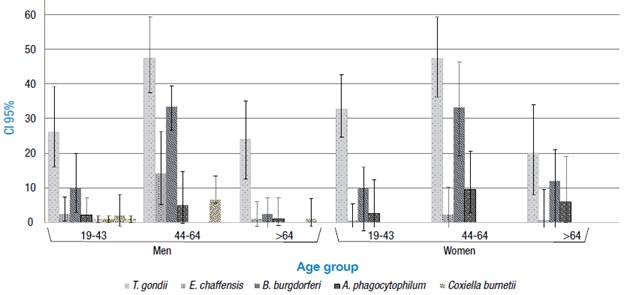 The frequency of seropositivity was statistically higher as the age group increased: 0.7% in individuals under 30 years of age and 40% in older adults. The frequency of T. gondii (47.3%), B. burgdorferi (33.3%), A. phagocytophilum (9.52%), E. chaffensis (2.3%) andL. interrogans (2.3%) was statistically higher in women over 50; the frequency of C. burnetii (2.3%) and F. tularensis (2.3%) was statistically lower in young adults. On the other hand, the seropositivity of T. gondii (47.5%), B. burgdorferi (33.5%), E. chaffensis (14.3), C. burnetii (6.64%), F. tularensis (6%), A. phagocytophilum (4.89%) andL. interrogans (1.4%) was statistically higher in men between 45 and 50 years of age (Figure 1).
