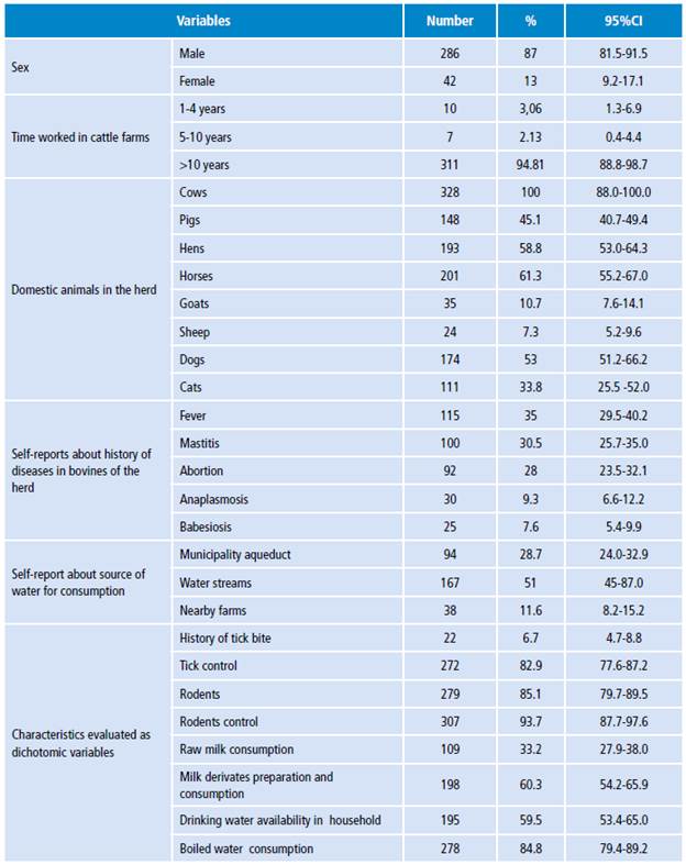 The participants of the study were 328 farmers, 13% female and 87% male. The ages ranged from 19 to 76, with an average of 48. Regarding central values, 50% were between 48 and 57 years old and the age of most participants ranged between 46 and 69 years. For both sexes, the lowest ratio was made up of individuals under the age of 35. Most participants had at least completed elementary education, 96.6% had worked for more than 10 years in cattle farms, and 7.6% stated that they had been bitten by a tick at least once (Table 1).