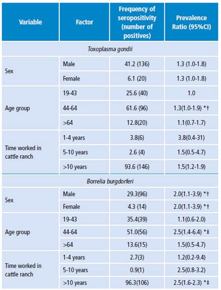 The frequency of both T. gondii and B. burgdorferi was statistically associated with sex, age group and time worked in cattle ranches, being higher in men than in women between 44 and 64 years of age with 30% (prevalence ratio 1.30) and 20% (prevalence ratio 2.0) respectively, and 50% (prevalence ratio 1.50 and 2.50 respectively) in farmers with more than 10 years of work experience (Table 2). Regarding the other factors analyzed, no statistical correlation was observed with the seropositivity detected in this study.