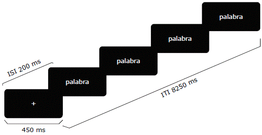 Figura 1: Paradigma experimental de presentación de estímulos visuales (palabras) con 450ms de exposición por palabra, intervalo inter-estímulo de 200ms y un intervalo inter-ensayo de 8250ms.