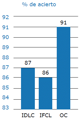El porcentaje de aciertos fue mayor en las OC (Figura 2). Las condiciones que presentaron dependencia de variables en la precisión de respuesta fueron OC con IDCL con un X2=4.69, (p=0.03) y OC con IFCL con un X2=4.69 (p=0.03). Por su parte, las condiciones IDCL e IFCL presentaron independencia de variables en la precisión de respuesta con un X2=0.388 (p=0.53).