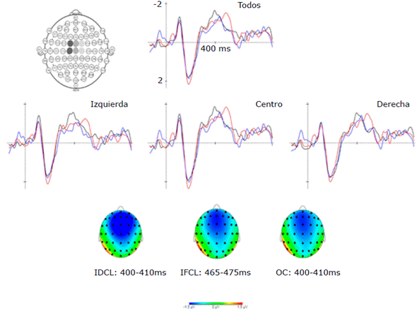Las diferencias de amplitud de este componente entre el procesamiento de las oraciones IDCL e IFCL no fueron estadísticamente significativas (F=0.279 (p=0.757)) considerando la ventana temporal del componente observado; no obstante, la diferencia en la latencia del componente entre estas oraciones sí fue estadísticamente significativa. En particular, al realizar un ANOVA se observó un F=71.12 (p=0.000) para la latencia del componente con la agrupación de las tres áreas de interés (Canal izquierdo; C1/FC1; derecho: C2/FC2, y Central Cz/FCz en las oraciones IDCL e IFCL. Además, en el análisis post-hoc entre las tres condiciones se observaron los siguientes valores: entre IDCL e IFCL: t=-12.055, Cohen's d = -2.301 / pTukey≤0.001; entre IDCL y OC: t=-6.385, Cohen's d = -1.226 / pTukey≤0.001, y entre IFCL y OC: t=-5.619, Cohen's d=-0.951 / pTukey≤0.001. Por otra parte, se observó un componente positivo sobre los 500ms que se podría asociar al componente tardío positivo; sin embargo, no se observaron diferencias estadísticamente significativas para este componente entre los tres tipos de oraciones.