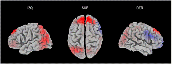 Figura 5: Solución inversa de oración congruente menos incongruencia dentro del campo léxico. IZQ: vista izquierda; SUP: vista superior; DER: vista derecha.