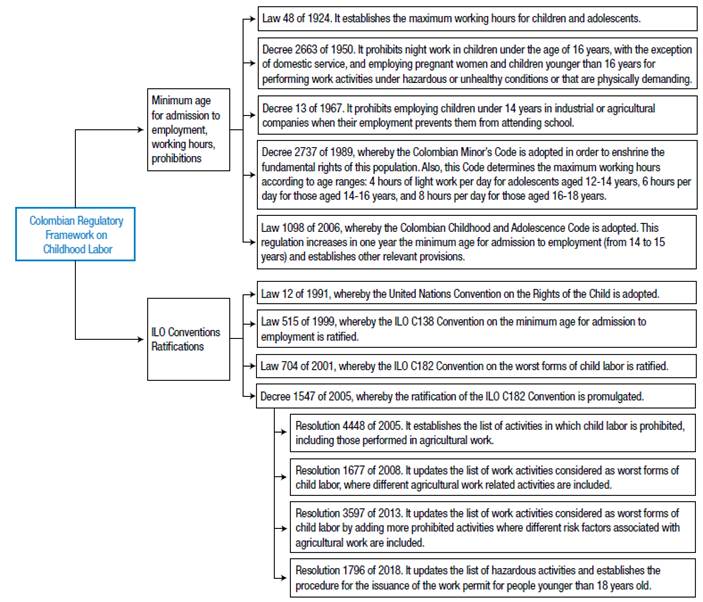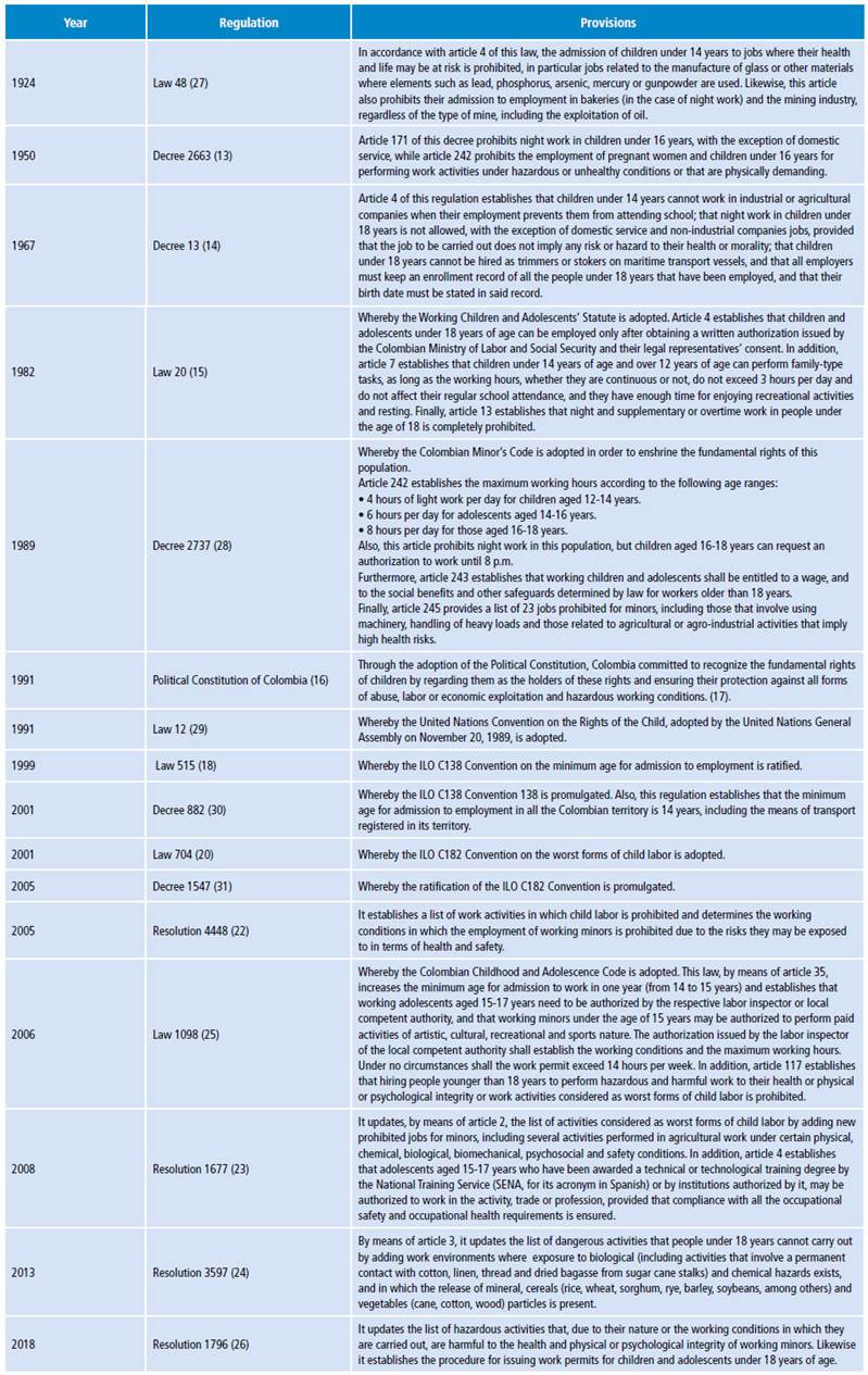 In Colombia (Figure 1 and Table 1), a regulatory framework on child labor was first established with the issuance of the Colombian Labor Code in 1950 13, and then it was updated with the adoption of Decree 13 of 1967. 14 Later, by means of Law 20 of 1982 15, a specific legislation on child labor was established, as well as the types of work in which working children and adolescents participation was prohibited.