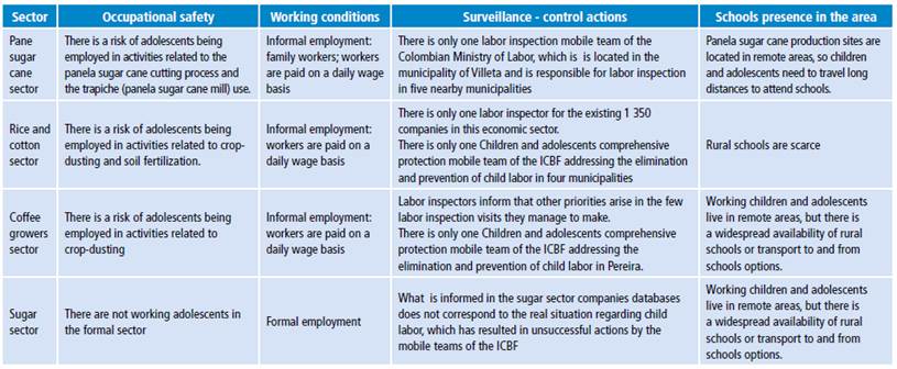 Thanks to the fieldwork conducted here, it was possible to confirm that, as in the case of other countries 12, children and adolescents work informally, while in the industrial production and formal economy sectors there is no evidence of child labor. In this sense, unpaid family labor was mainly found in the panela sugar cane and the coffee growing sectors, provided that agricultural work in these sectors occurs within a family subsistence context.