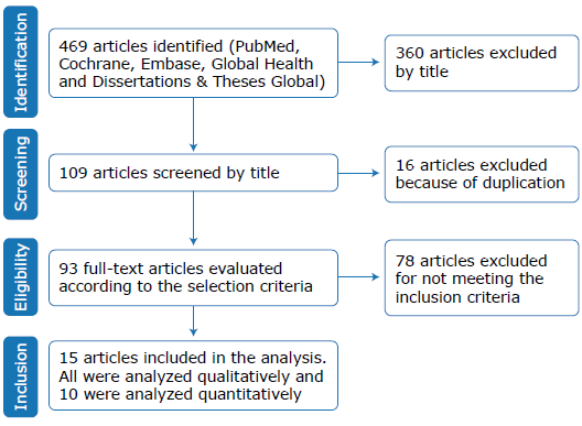 The search yielded 469 articles in the PubMed, Cochrane/ EBM Reviews, Embase, Global Health and Dissertations &Theses Global databases. 360 studies were excluded according to their title, 16 because they were duplicated and 78 for not meeting the selection criteria -32 were conducted outside Canada or Europe, 27 did not evaluate any screening tool, 11 were secondary studies (reviews), 4 included adult patients and 4 were incomplete or in another language. The final sample consisted of 15 studies.