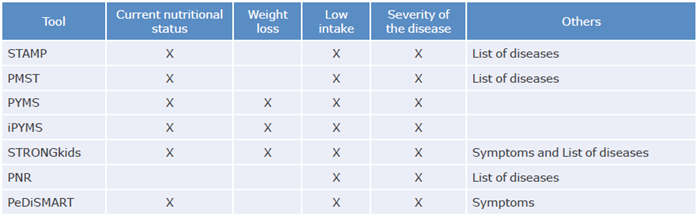 Seven tools have been validated in European countries for the identification of pediatric patients at nutritional risk: Paediatric Yorkhill Malnutrition Screening (PYMS), Infant Paediatric Yorkhill Malnutrition Score (iPYMS), Pediatric Digital Scaled Malnutrition Risk Screening Tool (PeDiSMART), Paediatric Nutritional Risk (PNR), Screening Tool for the Assessment of Malnutrition in Paediatrics (STAMP), Paediatric Malnutrition Screening Tool (PMST) and Screening Tool for Risk of Impaired Nutritional Status and Growth (STRONGkids). All were designed to be used during hospital admission and, except for PNR, have the possibility of being used again after the first week of hospital stay.