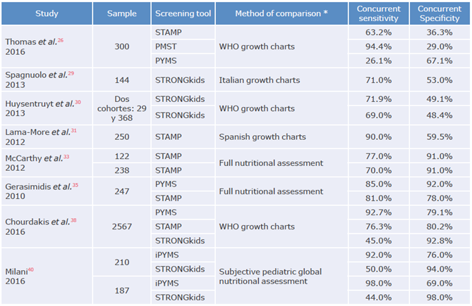STAMP: Screening Tool for the Assessment of Malnutrition in Paediatrics; PMST: Paediatric Malnutrition Screening Tool; PYMS: Paediatric Yorkhill Malnutrition Screening; STRONGkids: Screening Tool for Risk of Impaired Nutritional Status and Growth; iPYMS: Infant Paediatric Yorkhill Malnutrition Score; WHO: World Health Organization. * Concurrent validity (sensitivity and specificity) was estimated and extracted from the primary studies. Source: Own elaboration.