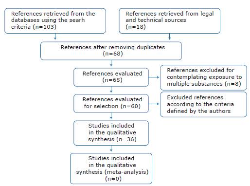 A literature review was conducted in PubMed, MedLine, ScienceDirect, and Embase looking for human studies published between 2013 and 2017 in English or Spanish. The following descriptors were used: "occupational exposure", "formaldehyde", "mutagenicity test" and "DNA adducts", their Spanish equivalents and their combinations ("occupational exposure AND formaldehyde AND mutagenicity test OR mutagenicity test AND DNA adducts"). This search retrieved 103 articles whose titles and abstracts were analyzed.