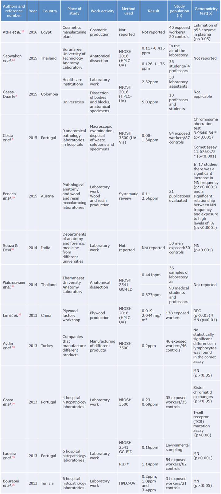 The 36 articles that met the inclusion and exclusion criteria were included. Most of the papers were observational studies in which the concentration of FA was quantified, and genotoxicity tests were performed to establish the relationship between exposure to FA and the health consequences among OEW. Some of the health effects reported in the articles include acute responses such as airway and eye irritation, while chronic effects were analyzed by means of genotoxicity biomarkers,23 which allow identifying and characterizing the damages that can be caused by this pollutant. Table 1 presents the results of the included articles that were considered most relevant to the objective of this study.