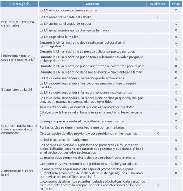 Una vez finalizado el proceso de lectura y análisis de los diferentes documentos, se procedió a identificar las creencias en torno a la LM, las cuales se clasificaron según las categorías establecidas por la Unicef (creencias respecto a la madre, a la calidad de la leche y a lo que necesita el bebé),14 y se seleccionaron las que a criterio de las autoras eran más comunes. Posteriormente se realizó una búsqueda bibliográfica adicional para identificar los argumentos a favor o en contra de cada una de las creencias y de acuerdo con la evidencia se estableció su veracidad o no.