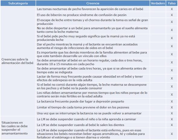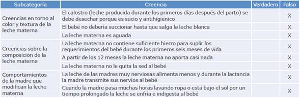 Al analizar los 50 documentos, se identificaron 58 creencias en torno a la LM, las cuales se agruparon en tres categorías principales establecidas por la Unicef:14 creencias en torno a la madre, a la calidad de la leche y a lo que necesita el bebé (Tablas 2, 3 y 4). Dada la amplia variedad, las autoras establecieron una categoría propia (Tabla 5) que agrupó otras creencias. Cada categoría contó con subcategorías que facilitaron la presentación de la información.