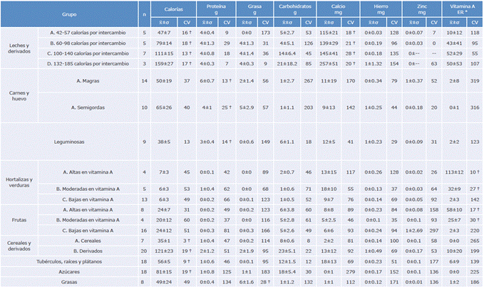 * Equivalente de retinol. † Estos valores corresponden al coeficiente de variación que determina la homogeneidad del grupo de alimentos acorde a su nutriente principal. Fuente: Elaboración propia.
