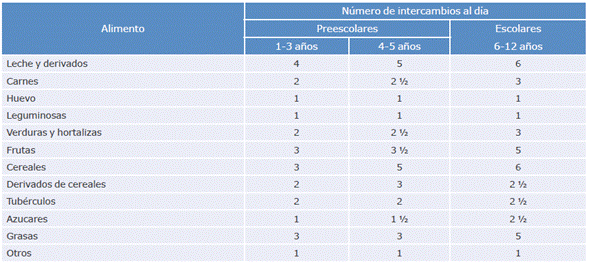 Tabla 3: Intercambios necesarios para cubrir las Recomendaciones de ingesta de energía y nutrientes en población preescolar y escolar del Ministerio de Salud y Protección Social.